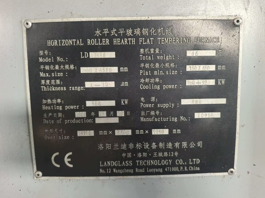 急卖二手玻璃钢化炉,二手蓝迪钢化炉,二手2.4米钢化炉,二手洛阳蓝迪钢化炉,二手3.6米蓝迪钢化炉,二手洛阳蓝迪玻璃钢化炉,2.4米X3.6米,2006年洛阳产,《设备在位车间安装使用中,你可以现场先开机试验满意后,再决定是否购买》